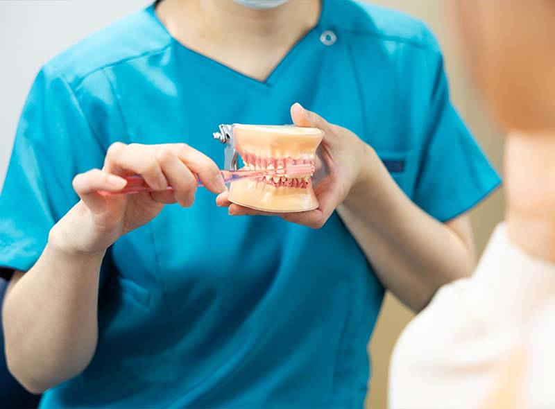 「歯磨きは生活の基本」と言われるように、正しい歯磨きの習慣は口腔の健康維持に不可欠です。しかし、歯磨きの方法を間違えていては、せっかくの努力も台無しになってしまいます。当院では、患者さま一人ひとりに合わせた歯磨き指導(TBI)を行っています。歯ブラシの選び方や磨き方のポイントなど、歯科衛生士が丁寧にアドバイスいたします。