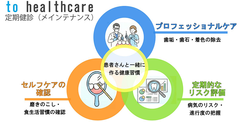 to healthcareでは、むし歯のリスク、歯周病のリスクと口の機能の発育や低下を評価し、定期健診(メインテナンス)を通じて健康を守る医療を行っています。