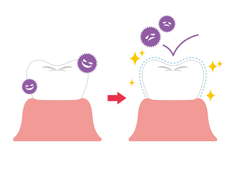 フッ素は溶けてしまった歯を戻すことを促進するとともに、歯を強くする作用があります。市販の歯みがき粉のほとんどに配合されていますが、濃度や使用方法によって効果が大きく減弱するため、患者さまに合った良い使用方法や頻度を説明させていただきます。