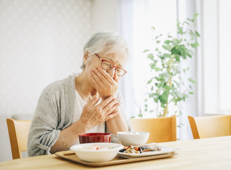 飲み込みの力が落ちると、食べ物や唾液が気管へ流れ込む「誤嚥」が起こりやすくなります。口の中の細菌が肺に持ち込まれることで発症するのが誤嚥性肺炎で、高齢者にとっては命に関わる疾患です。